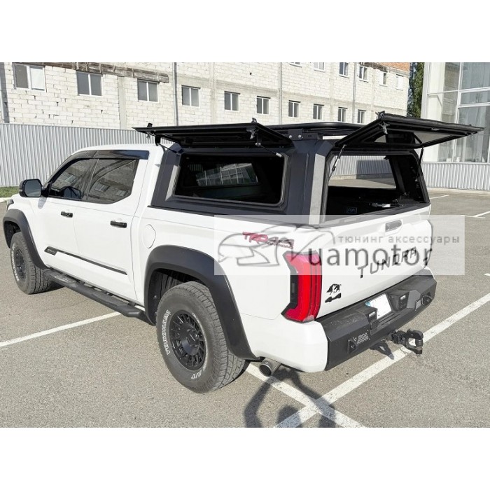 Кунг алюмінієвий Toyota Tundra 2022+ в кожній комплектації бічні вікна піднімаються вгору - великий плюс у зручності експлуатації.