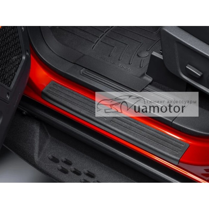 Накладки на пороги Weathertech Ford Bronco виготовлені з удароміцного пластика індивідуально саме під це авто. Основною функцією є захист внутрішніх дверних порогів від подряпин і повсякденного зносу.